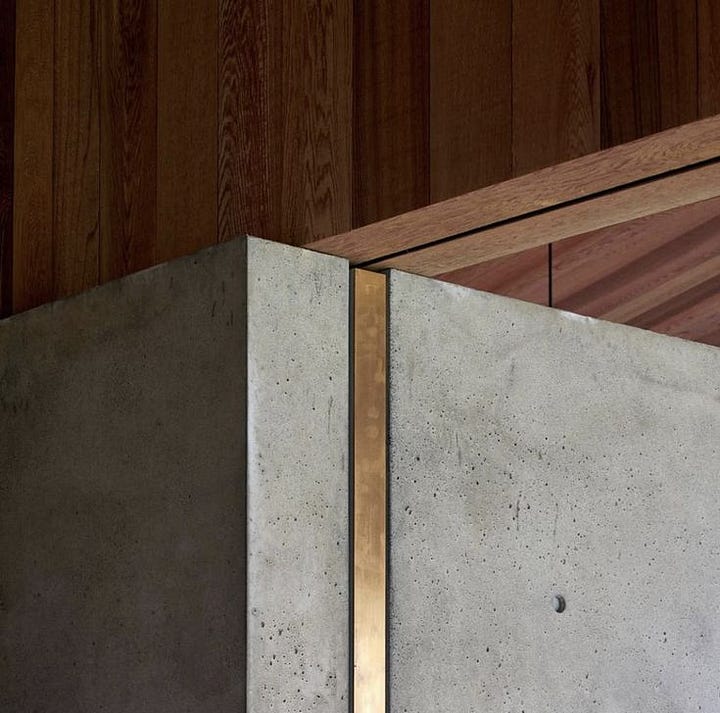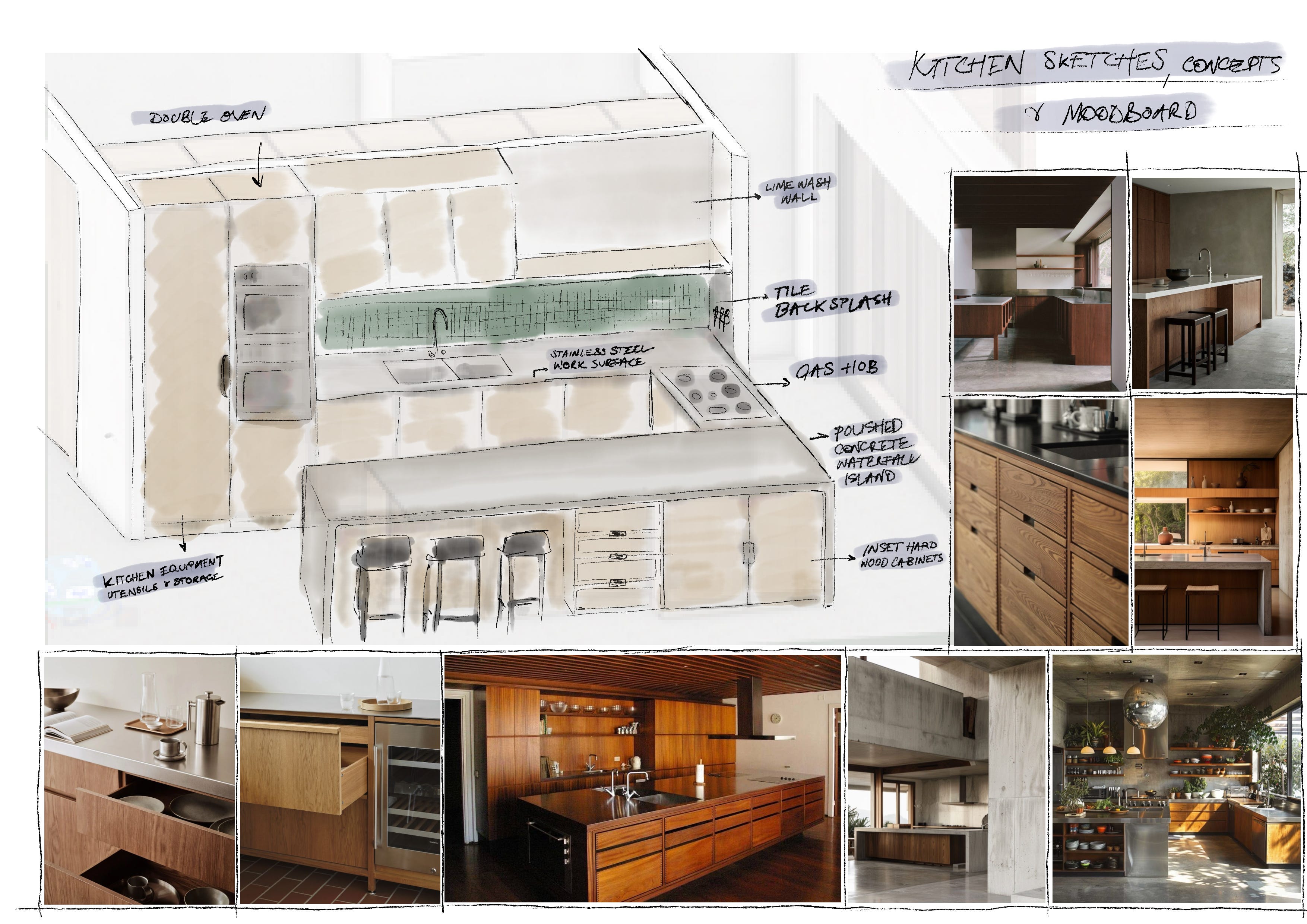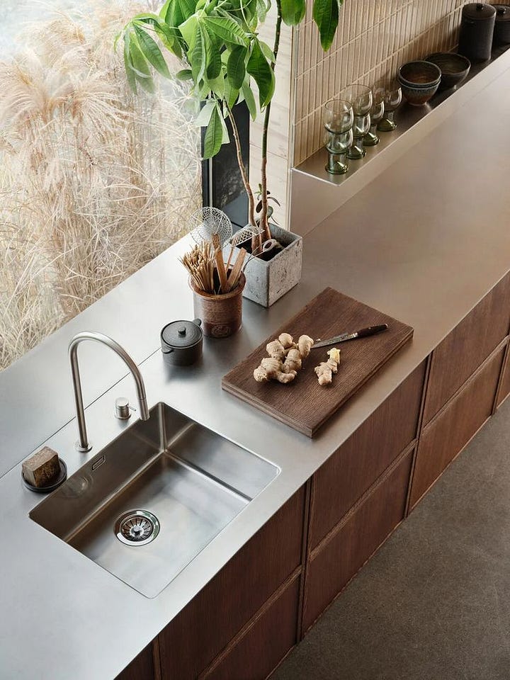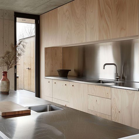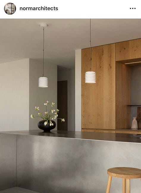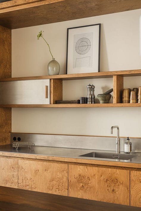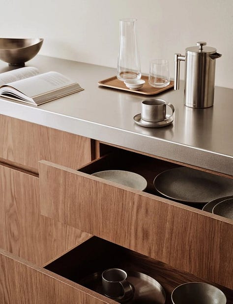 Material-wise, this kitchen needs to feel layered rather than uniform. Not one finish everywhere. I’m drawn to a mix of stainless steel, timber, polished concrete, softness from fabrics and materials and considered lighting. Something robust enough for daily use, but warm enough to live with. After years of carting too much stuff from house to house, we’re craving clean lines and fewer, better-chosen pieces.