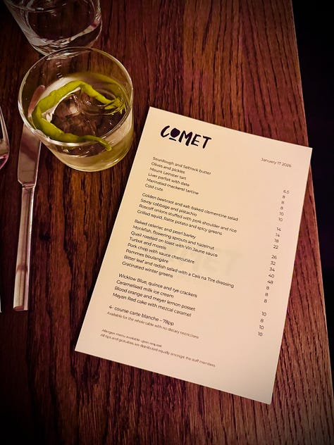 We’re halfway through January and I just had one of those wonderful life affirming meals in Dublin. Comet has been on my radar since it opened last year and their instagram feed began to fill with wood panelled, warm interiors, soft lighting and considered menu items. The glowing reviews followed, with whispers of Michelin greatness afoot. Hype aside, you step into this little back-alley gem off Dawson Street, away from the noise of boozy, loud watering holes and English-owned chains and into a quietly confident, shining example of a new wave of Irish cooking. The service zips into gear with the house aperitif, aptly named comet, white vermouth over ice with the brine of guindilla green ghillies and a solo chilli to garnish, which our server wisely recommended taking a bite of.