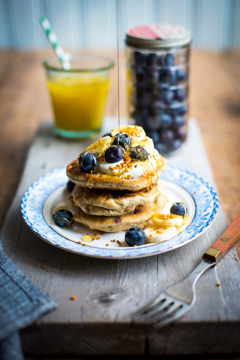 GLUTEN-FREE PANCAKES WITH BLUEBERRIES, BANANA & HONEY