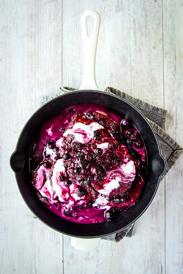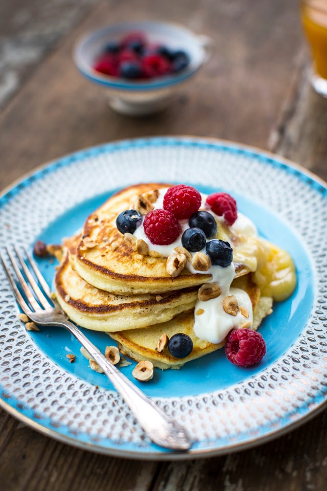 The addition of the blueberries to the pan once the pancakes have cooked creates a delicious juicy sauce which coats the pancakes, I like to add some honey here to sweeten it a little and helps to thicken any juices which come out of the berries. Make sure and fold the egg whites into the rest of the ingredients gently in order to keep as much air in the mixture as possible which will give light pancakes.