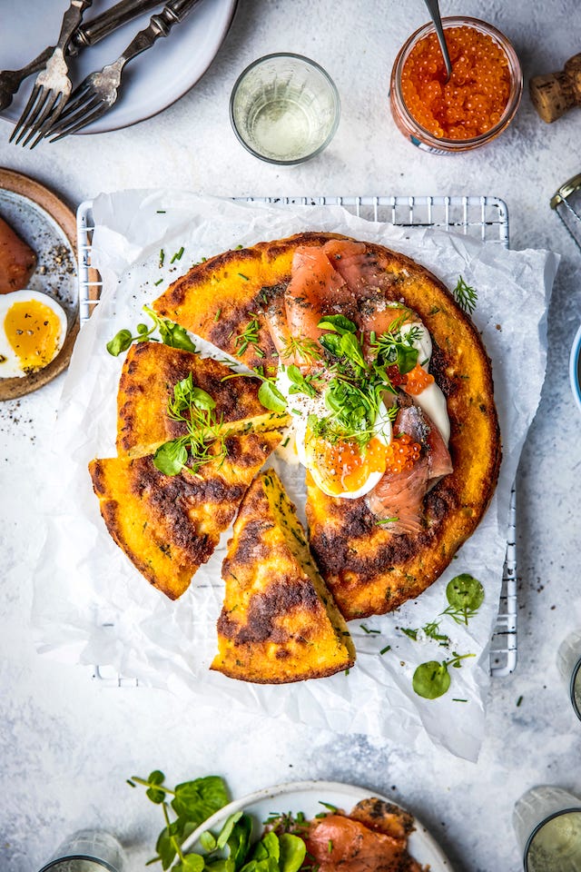 An altogether different way to approach pancake Tuesday this year and a really wonderful savoury pancake that can be served straight to table and dished out. If you can’t find sliced gravadlax, use smoked salmon. For a real treat track down the Goatsbridge Irish trout caviar. The trick to this pancake is patience. Once you pop the mixture in the pan put the lid on and don’t touch it until the timer rings.